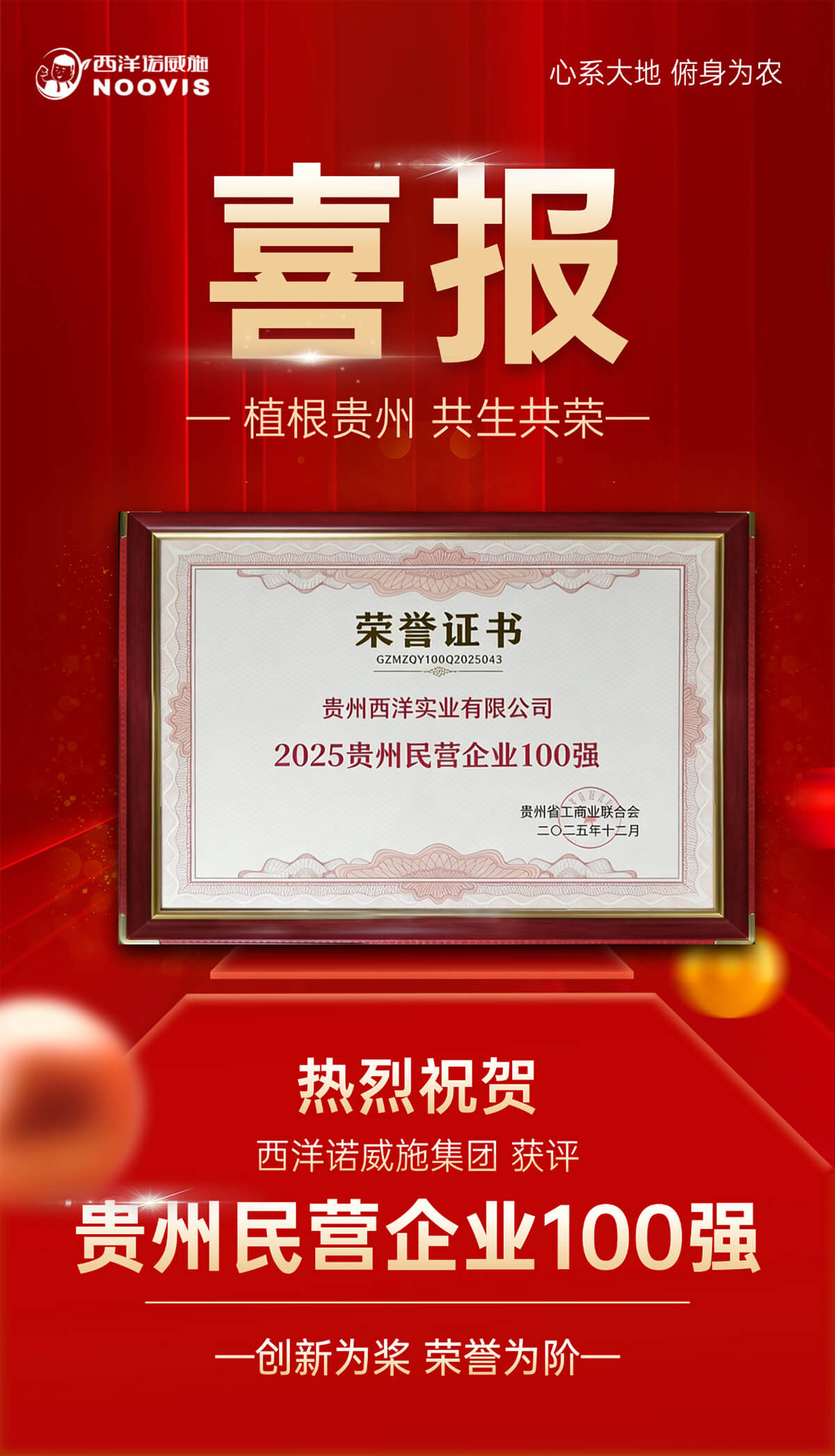 On December 24th, the 2025 Top 100 Private Enterprises in Guizhou list was released by theizhou Federation of Industry and Commerce in Guiyang. With its robust business performance, continuous investment in innovation, and outstanding social contributions, Xingyang Nuoweishi Group once again honored to be on the list. This is the company's consecutive years of receiving this provincial-level honor.